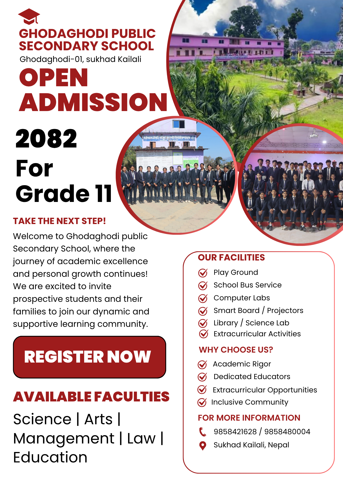 SEE मा पास भएका सम्पूर्ण Student लाई कक्षा ११ मा भर्ना खुलेको जानकारी गरिन्छ समयमै भर्ना भई आफ्नो सिट सुरक्षित गर्नुहोला। थप जानकारीको लागि 9858421628
