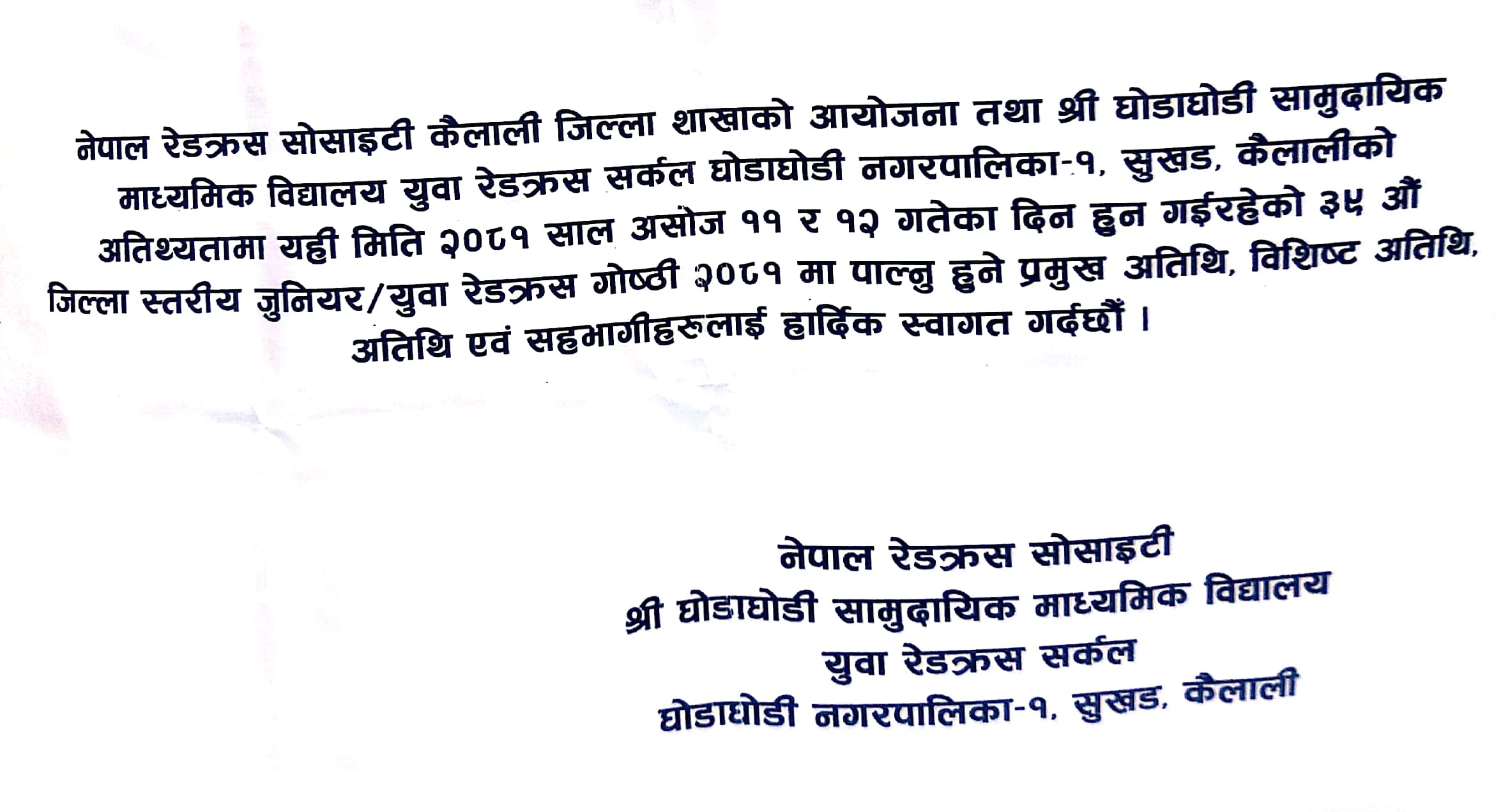 नेपाल रेडक्रस सोसाइटी कैलाली जिल्ला शाखाको आयोजनामा घोडाघोडी सामुदायिक मावि (GPSS School), घोडाघोडी नगरपालिका-१, सुखड, कैलालीमा जिल्ला स्तरीय जुनियर/युवा रेडक्रस गोष्ठी